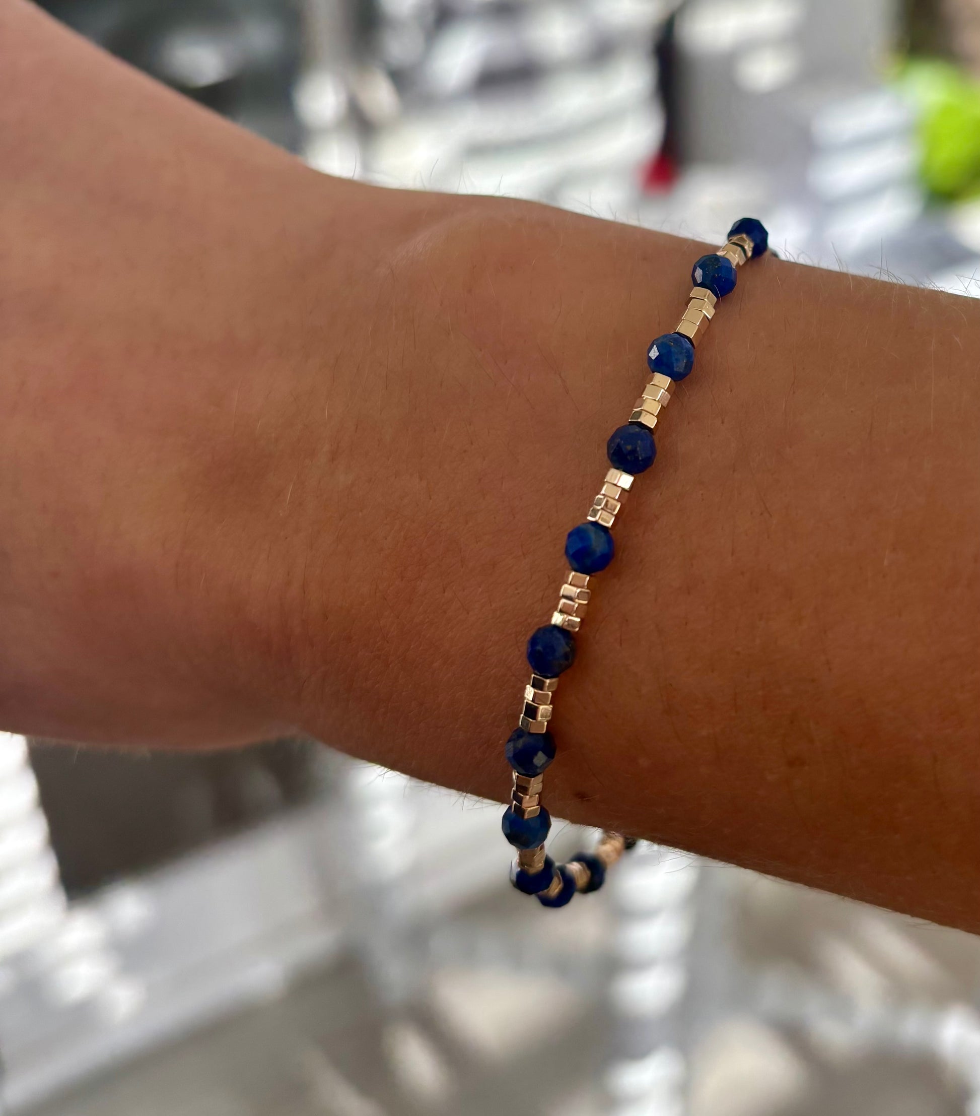 Discover the captivating allure of genuine lapis lazuli in this exquisitely crafted bracelet. Delicate faceted beads reveal mesmerizing flecks of gold and deep blue tones, while the gold plating adds a touch of refined sophistication. The flexible design features either an extender chain or secure clasp, ensuring a perfect fit for any wrist. Whether you're seeking a statement piece for special occasions or a refined everyday accessory, this bracelet delivers timeless elegance that complements any style. Invest in a piece that truly stands out.