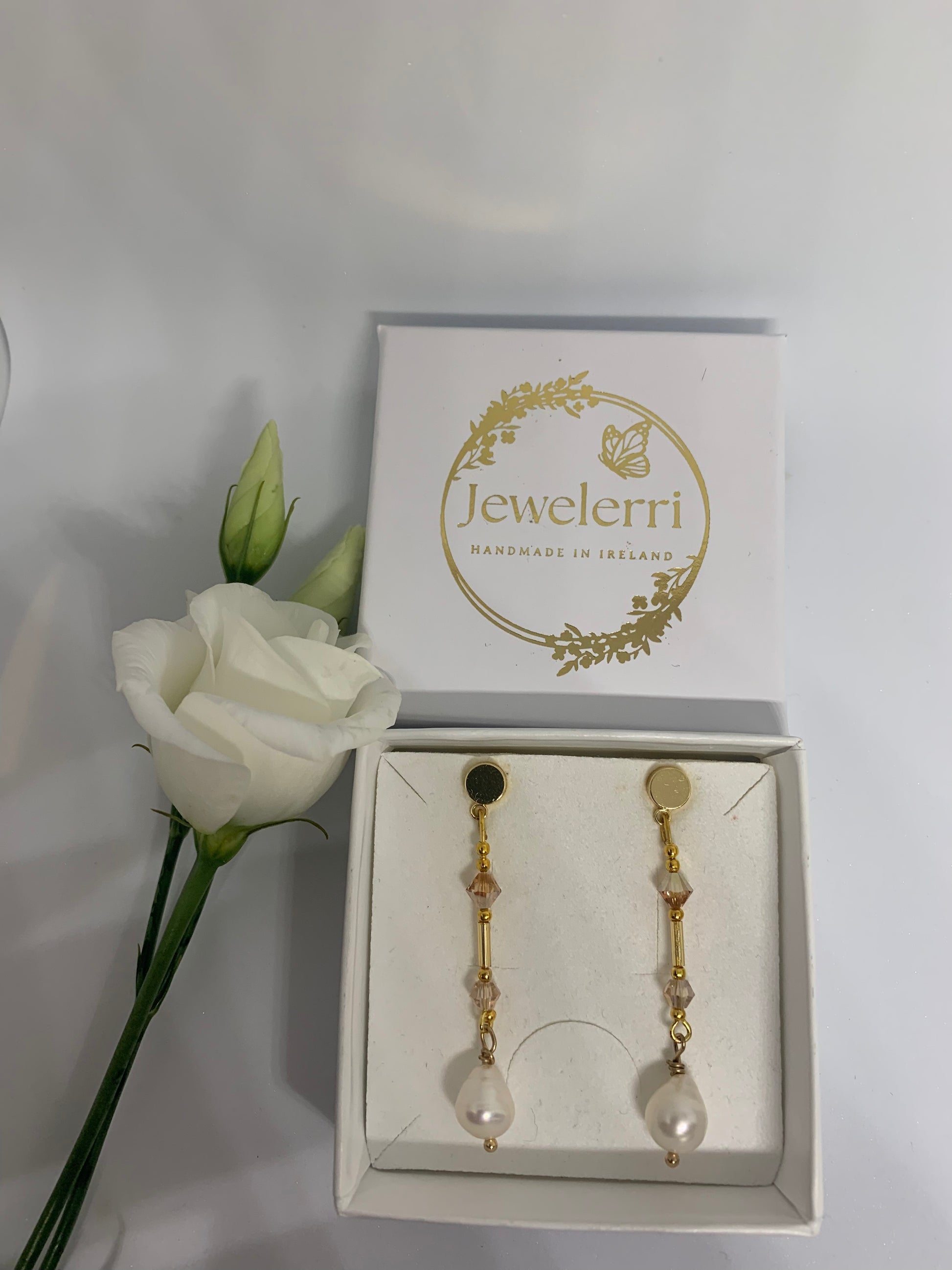 Elevate your look with our long Pearl & Gold Statement Earrings. Made with natural water pearls and 18 ct gold plated studs, these earrings are both elegant and beautiful. Featuring Swarovski crystals, they are also nickel and lead free for comfortable wear. Enhance your style with these stunning earrings.