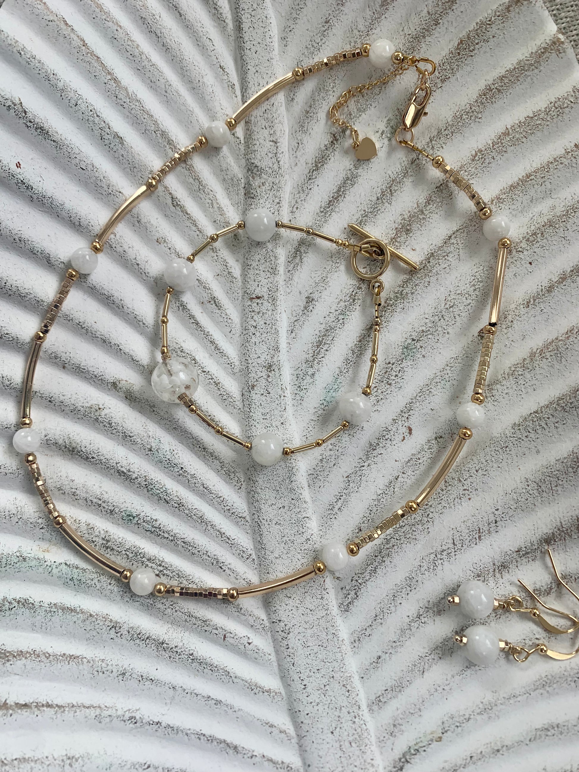 Elevate your ensemble with our exquisite Moonstone Necklace featuring luminous natural moonstone beads complemented by 14k gold-plated bars and accents. Designed to rest perfectly at the collarbone, this piece offers versatile styling with an integrated extender chain. The moonstone's ethereal glow creates a sophisticated yet subtle statement for both everyday wear and special occasions.
