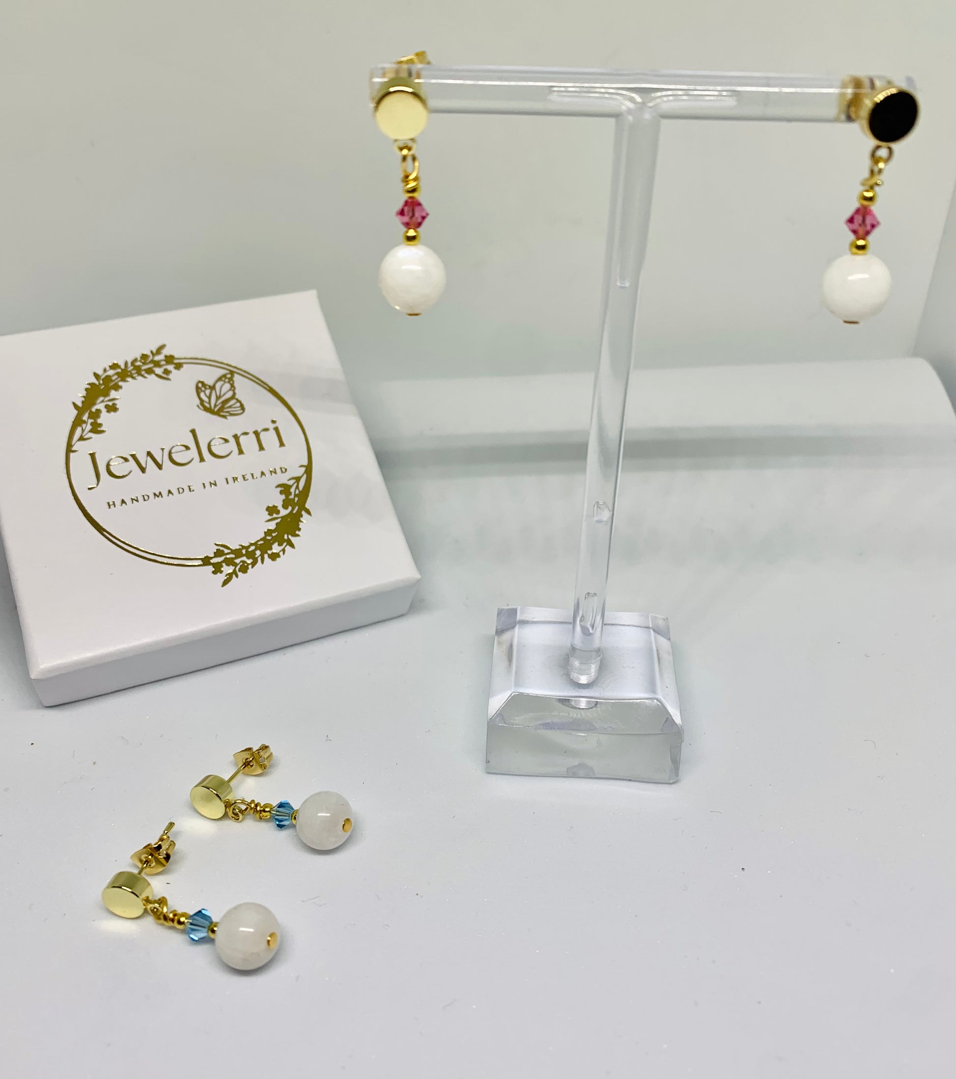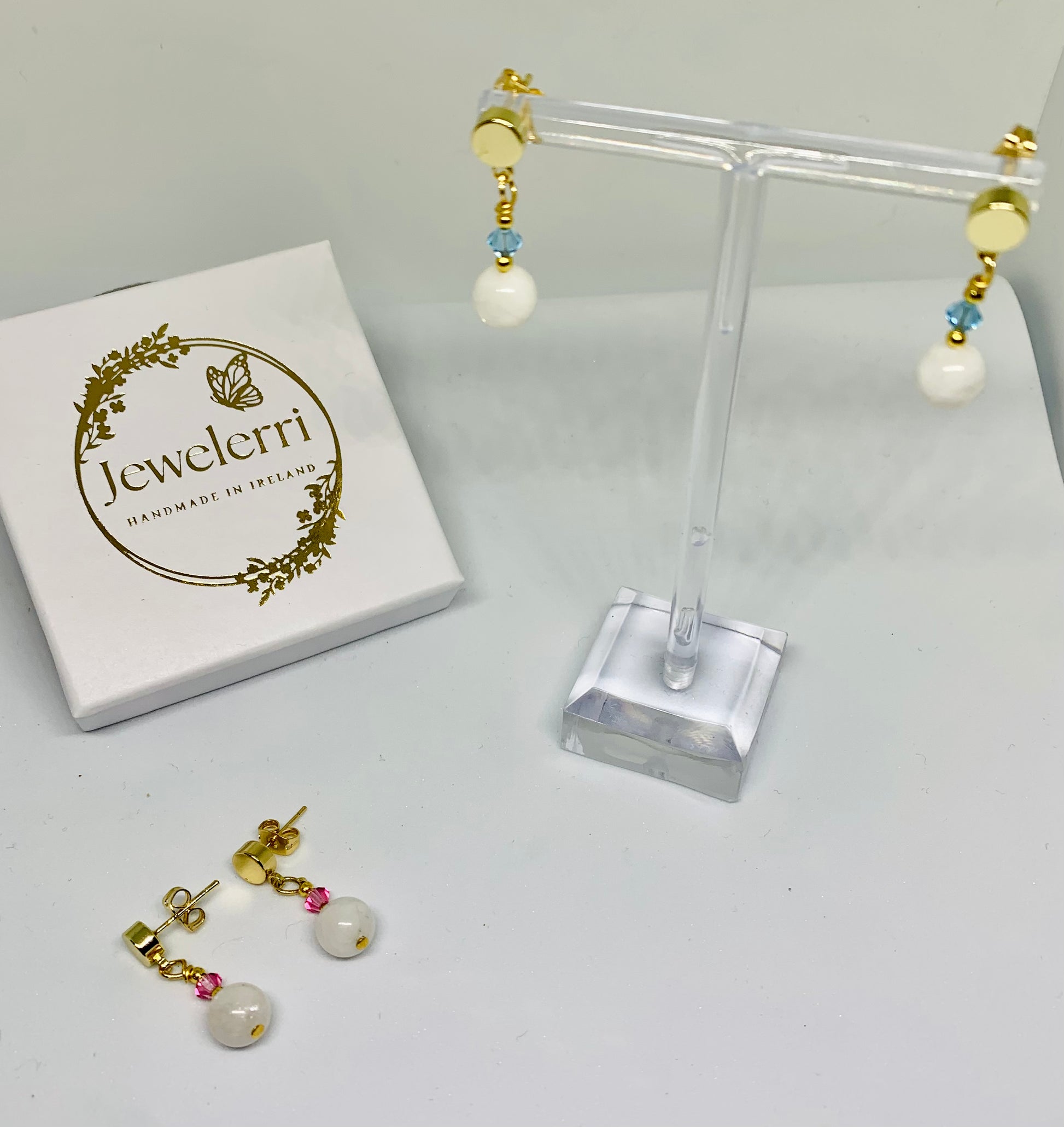 Elevate your accessories with our Petit gold stud Blue earrings. These 18 ct gold plated studs feature stunning blue crystals and moonstones, perfect for dressing up any outfit. Ideal for special occasions such as communions, confirmations, and wedding parties. With a delicate 3cm drop and nickel free design, they are both beautiful and comfortable.