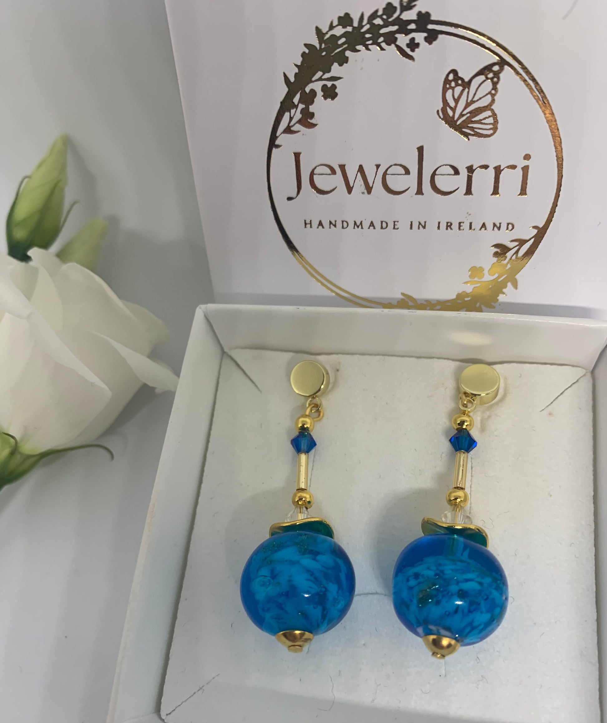 Achieve a bold and luxurious look with our Stunning Blue Murano creations.. Featuring a large murano stone 14mm and blue swarovski stones, these 18 ct gold plated studs are perfect for special occasions. Elevate your style with our limited edition statement earrings. 4.5 cm drop earings .All products are nickel free .limited edition.