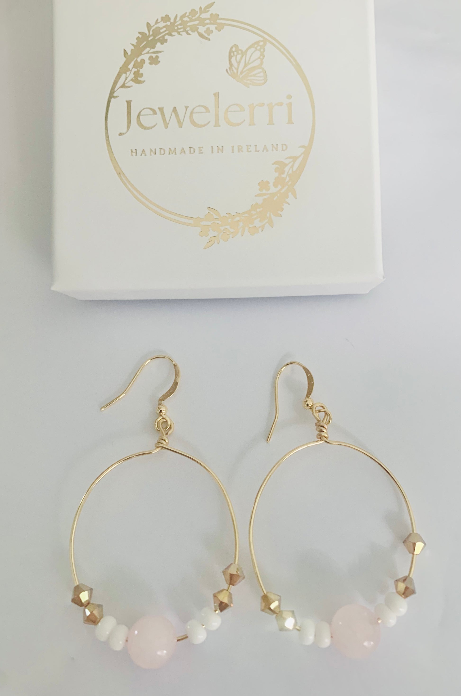 One of my original and personal favourite hoops. Pink Quartz with white & gold plated beads. The 30mm hoops, complemented by 10mm pink quartz beads and gold Swarovski beads, create a stunning and elegant design. The perfect accessory for adding a touch of sophistication to any outfit.